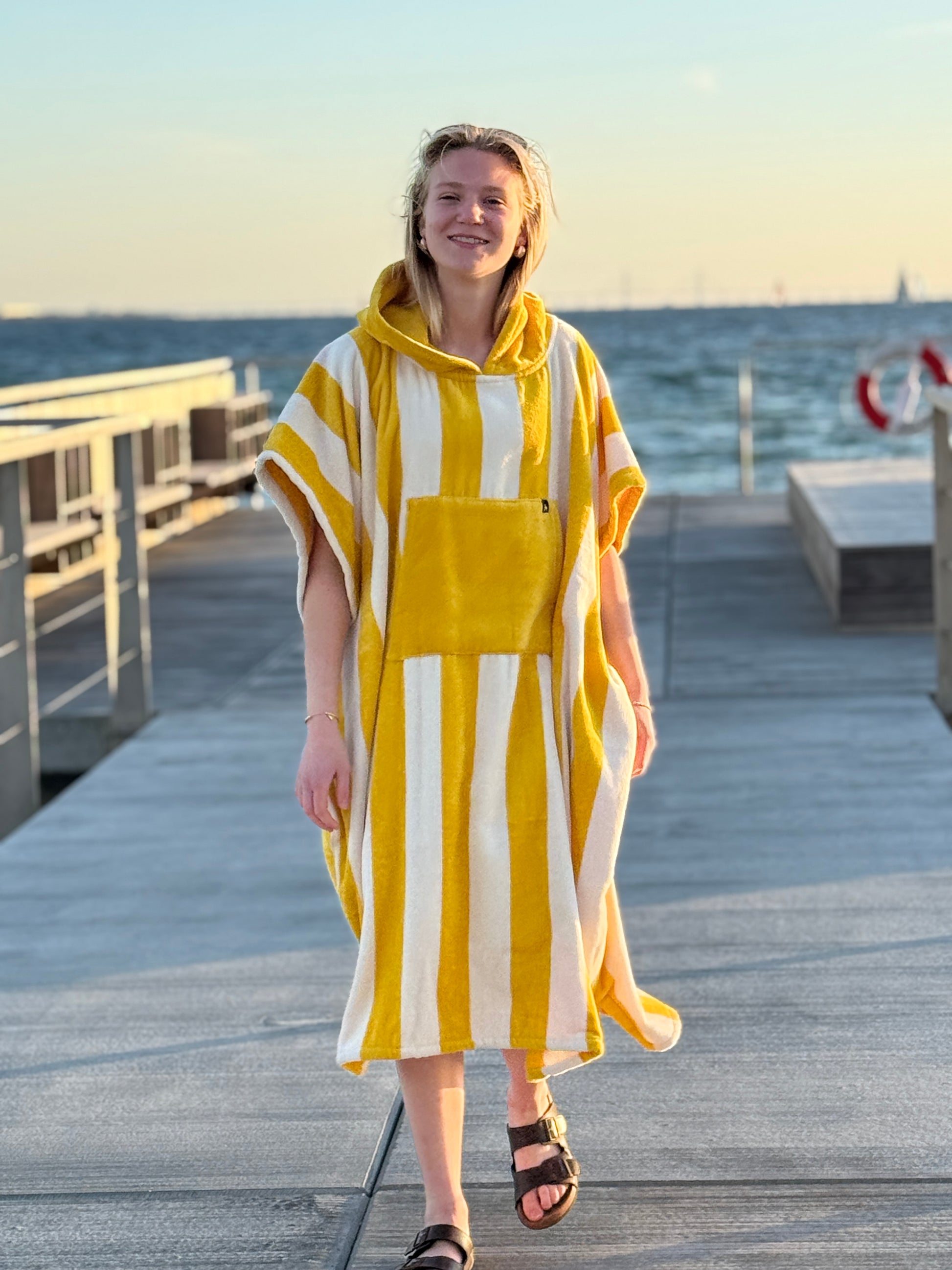 Terry Yellow-White Striped from Futah is a soft terry bath poncho that captures the joy of summer in every stripe. It is made of OEKO-TEX certified cotton and combines high quality with a colorful design that is seen and loved.