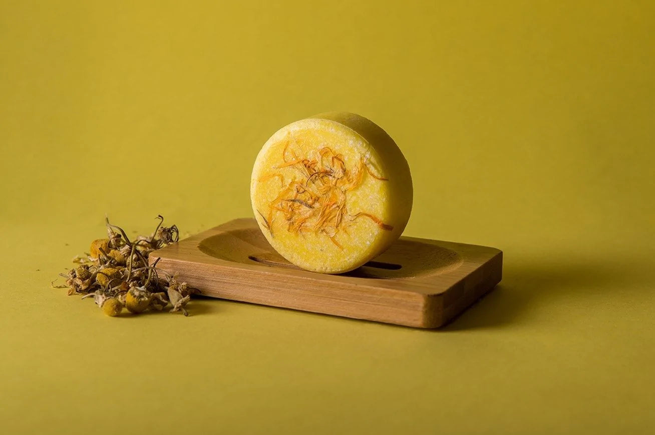 Chamomile Down Carry On Shampoo Bar cleanses and conditions intensively while providing a soothing effect. Its combination of beneficial nutrients also leaves the scalp feeling velvety smooth. Bring spring into your bathroom with this yellow shampoo bar that smells wonderfully of chamomile.