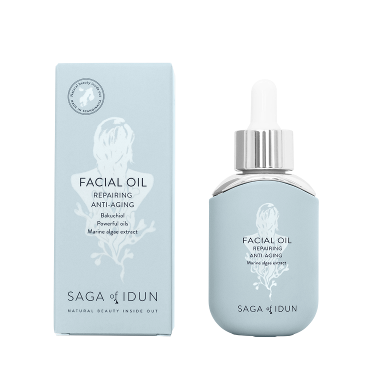 Saga of Idun Facial repairing oil is a blend of nourishing and repairing oils, bakuchiol and marine algae extracts, which have anti-aging properties that increase cell renewal, prevent and reduce fine lines and give your skin a nice glow.