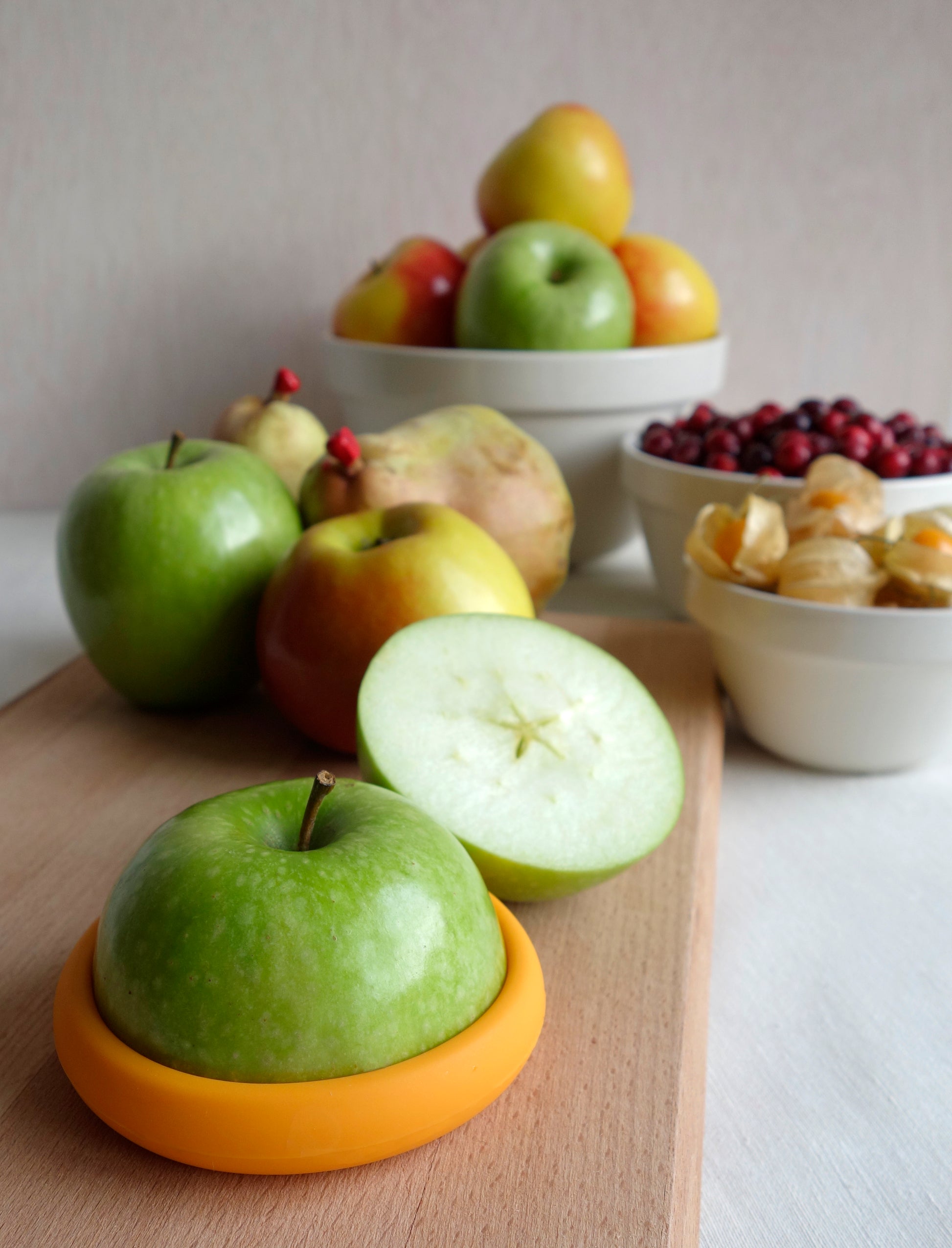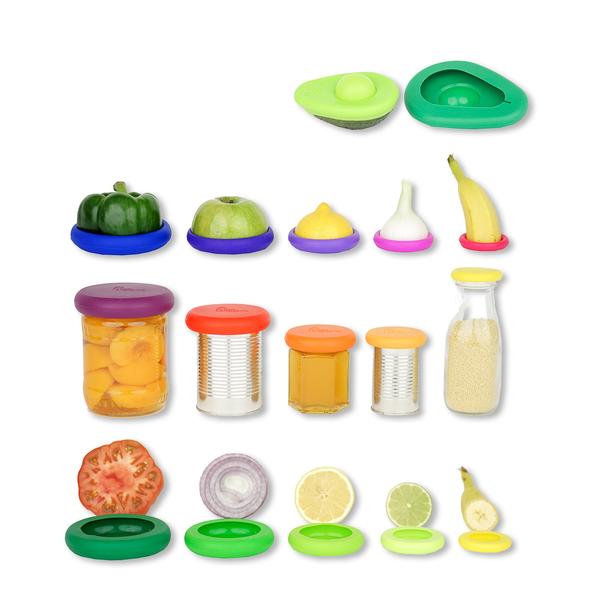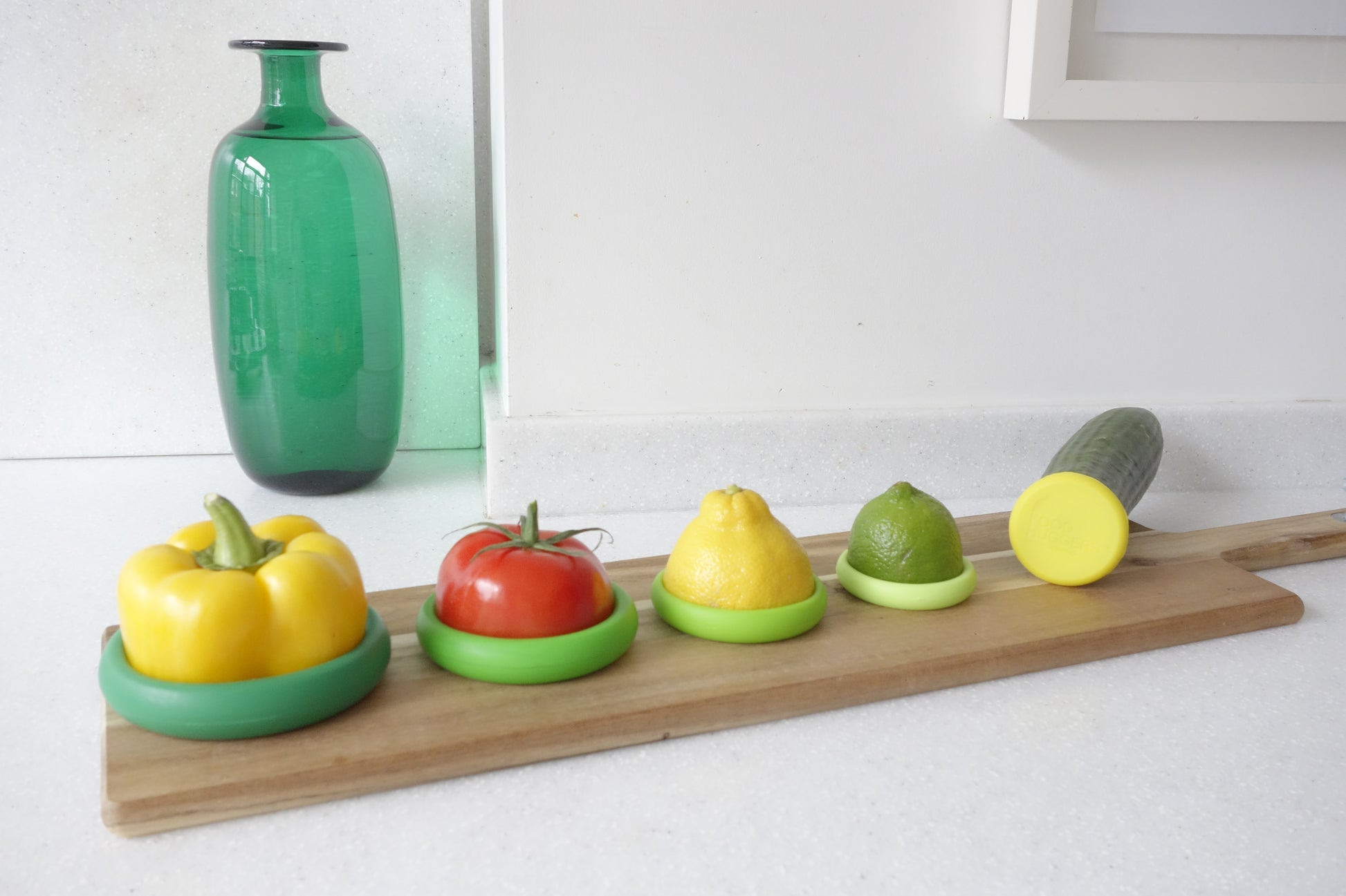 Food huggers are silicone lids that you put over halves of fruit and vegetables to keep them fresh for a long time. Fruit and vegetables go bad quickly if you cut them up and put them back in the crisper, but with food huggers they stay fresh much longer.