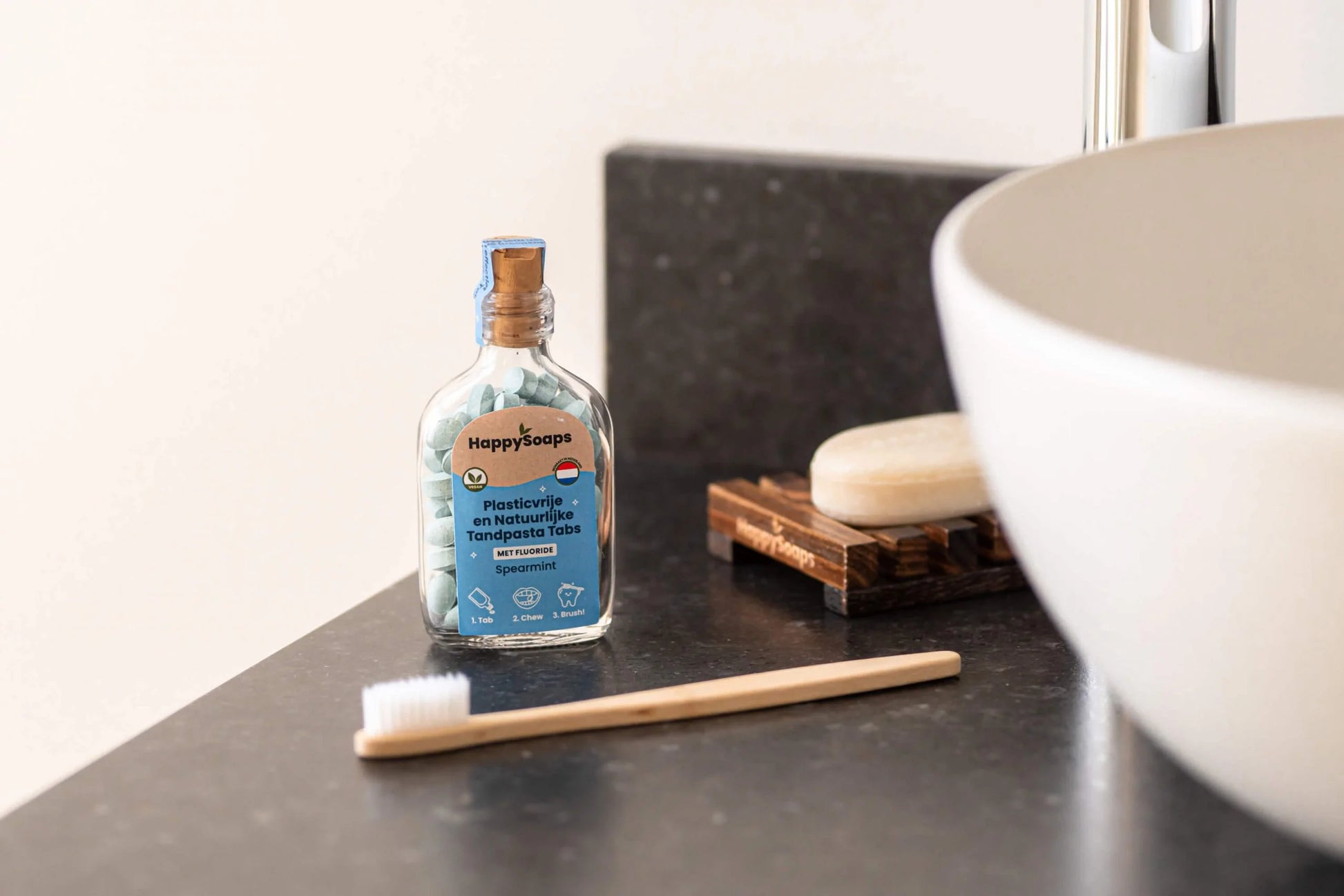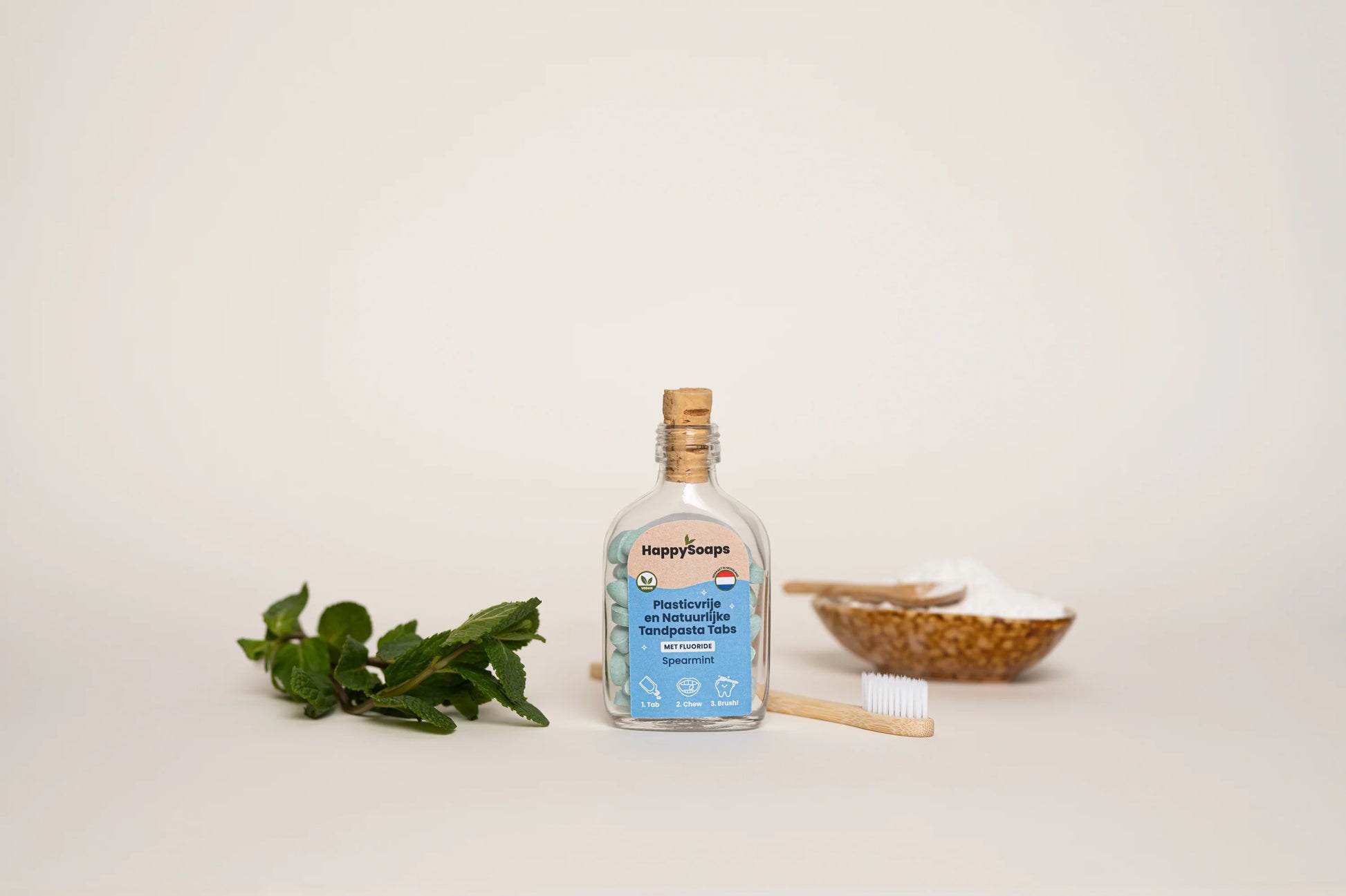 HappySoap's eco-friendly toothpaste effectively cleans your teeth without using any plastic. Simply put a toothpaste tablet in your mouth, chew and then brush your teeth with the resulting cream. With a wonderfully refreshing peppermint flavor.